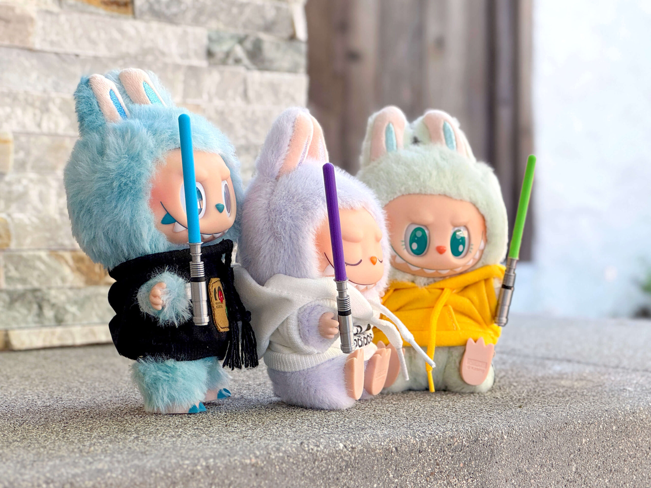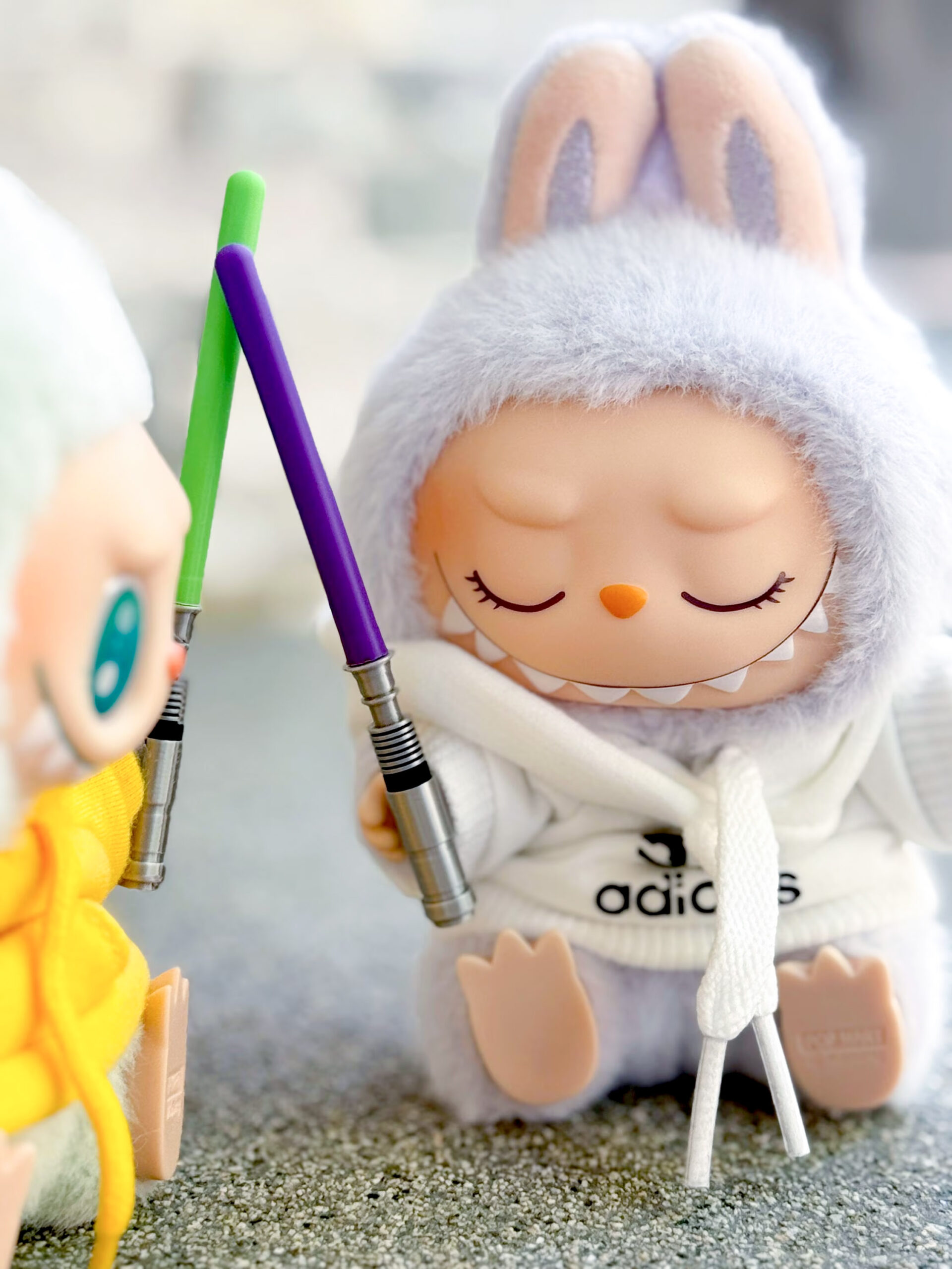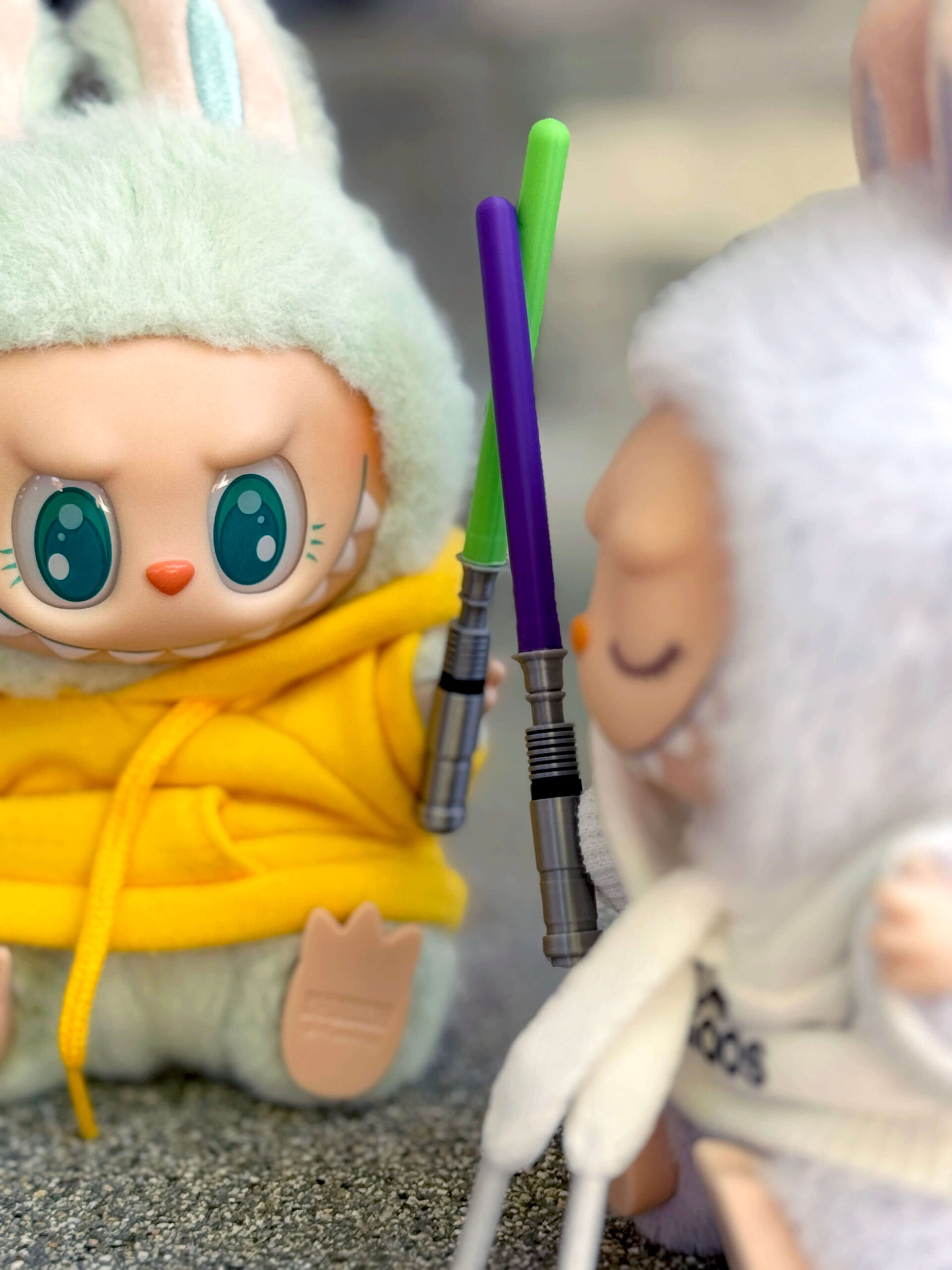 The Force is strong with this one ⚔️ Your Labubu can fight epic galactic battles (or at least cosplay) with these mini 3D printed lightsabers! Let your little Jedi monster rep their fandom with you! Available in four classic colors (green, red, blue, and purple), each saber comes with a clear arm ring that flips so it can be worn on either side. May the Force be with you!