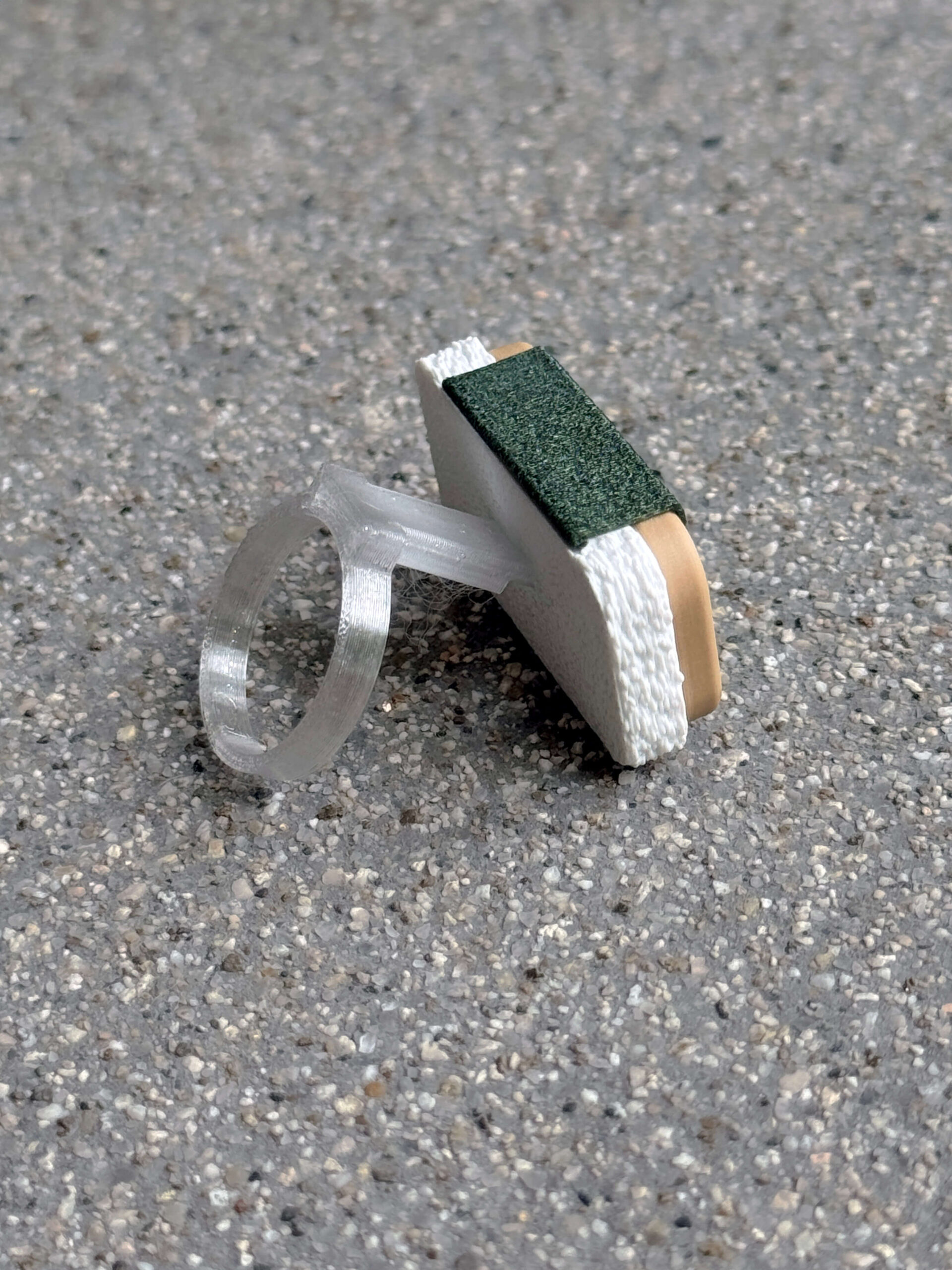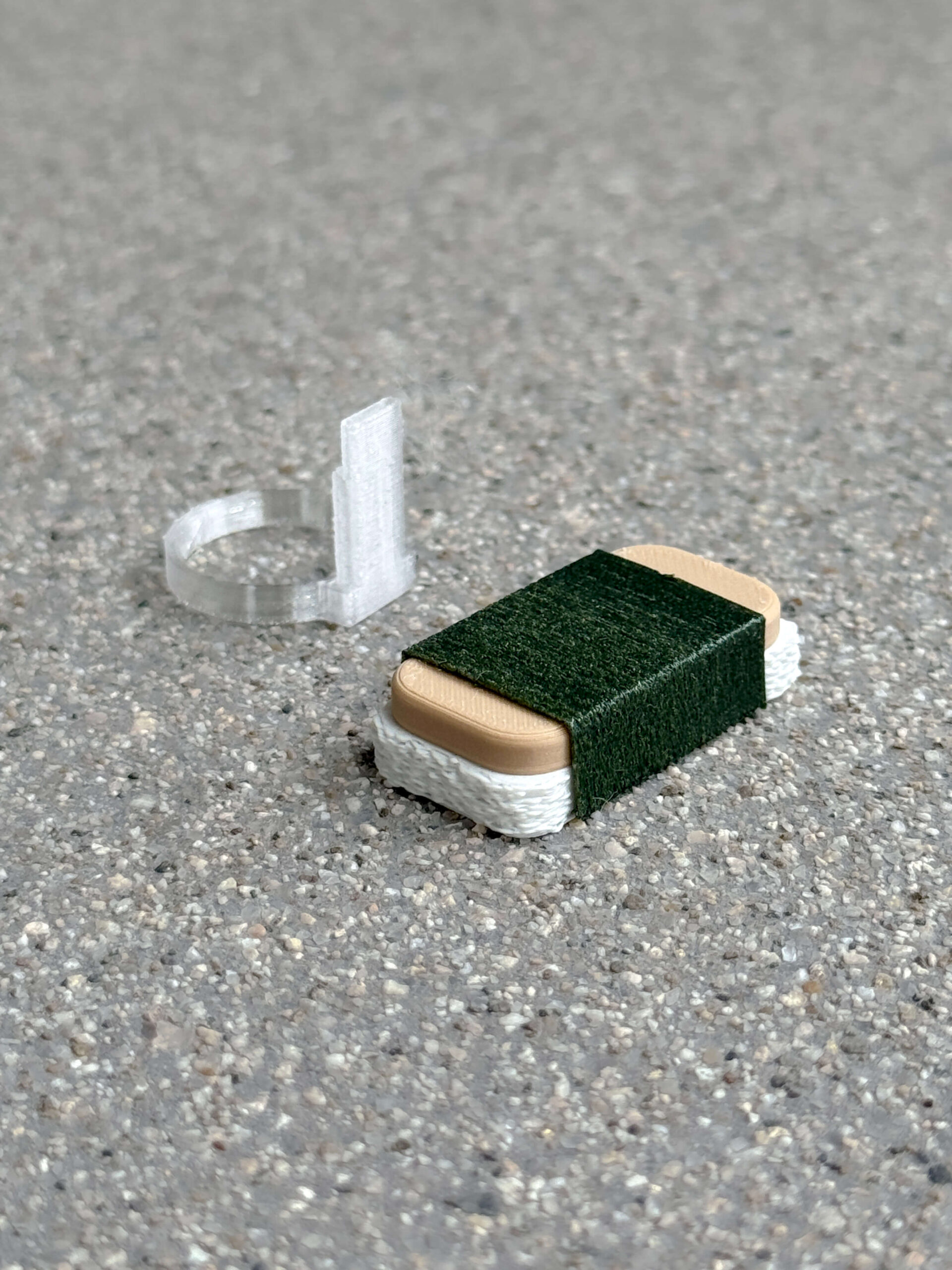Snack time, but make it stylish. 🍙 This 3D printed spam musubi accessory comes with a clear arm ring so your Labubu can carry it around like the true foodie they are.